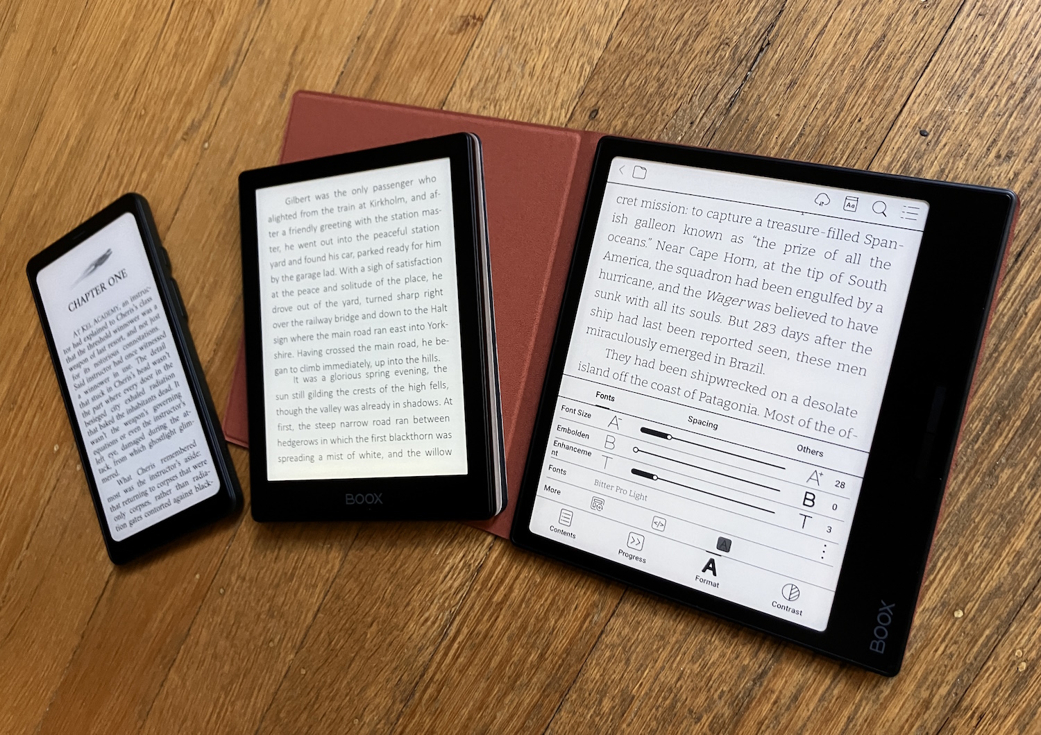 The Palma has a six-inch screen and 300 DPI like the rest, though it looks and feels (and is) smaller due to its phone-like aspect ratio. It runs a modified version of Android with minimal apps installed but has the ability to download more in a less roundabout way. The reading app, however, is the same, and it supports just as many formats, fonts and customizations.