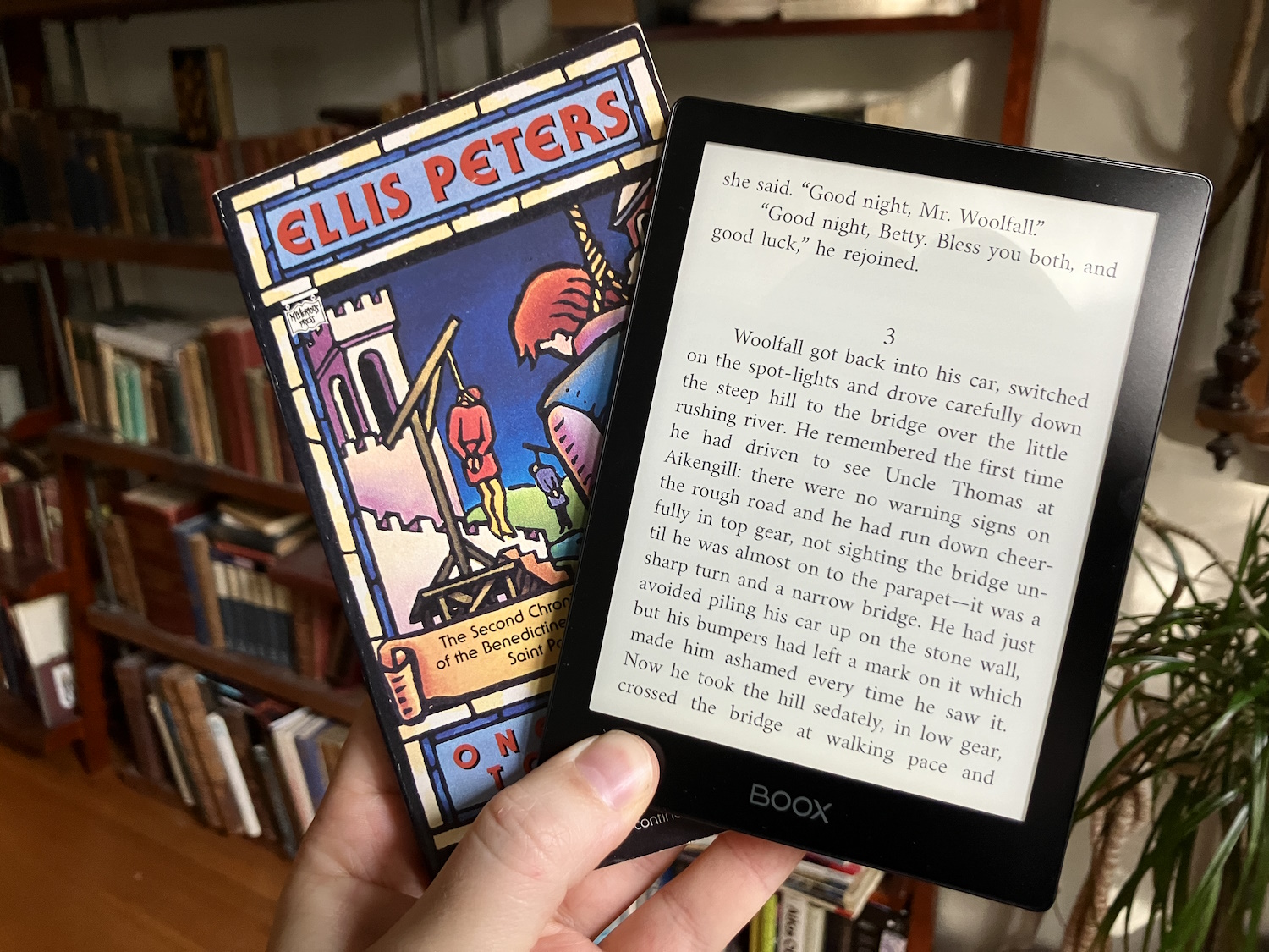 The Page retains the simplicity of the Poke 5, though it has a seven-inch screen (1264×1680, also 300 DPI). It is a flat rectangle with flush display and a handle with page-turn buttons on one side and power on the bottom (or top if you hold it left-handed). A minor complaint I had about this one is that the buttons are sort of joined rather than separate, and the farthest end of the long buttons doesn’t depress, meaning you have to press a little toward the center. It’s not a big deal, but it’s a strange choice and somehow the opposite of the Kobo Libra 2, which depresses on the far end of the button but not the inward side. Maybe there’s some kind of esoteric UI debate here I’m not party to, but there it is.