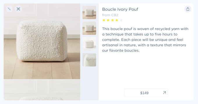 The company said that it doesn’t just look at the listing and description for search results. It also looks at materials, reviews, photos and more. This way, when someone searches for a “pet-friendly” couch, Deft can return results with stain and scratch-resistant material.