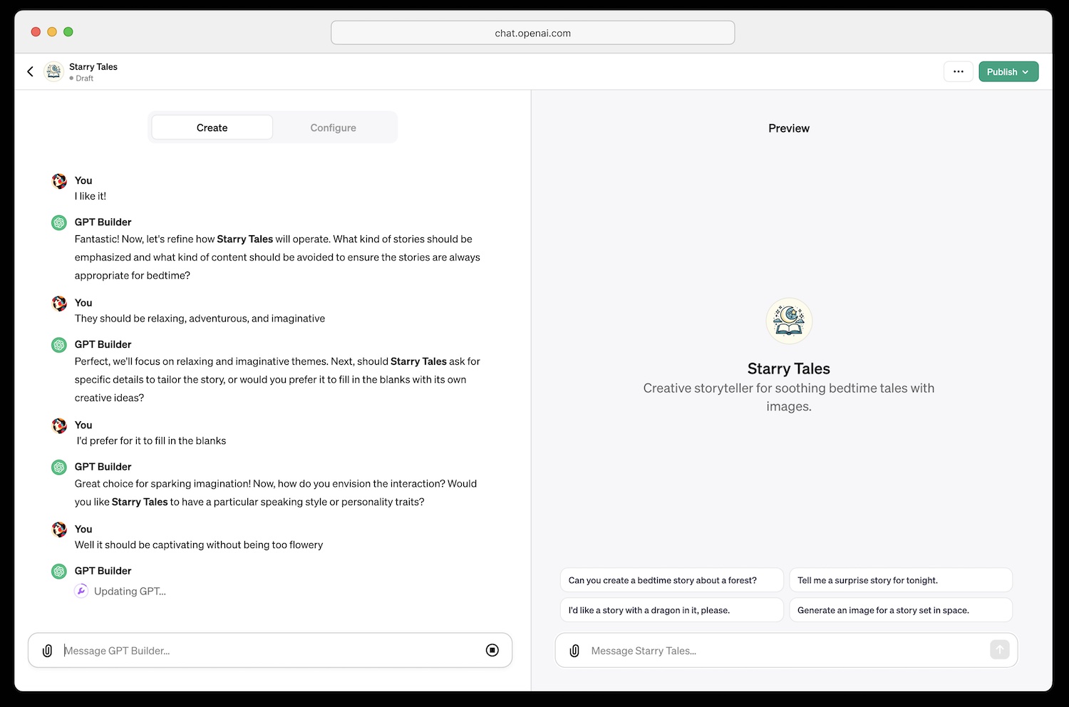 It’s possible to make a GPT just by chatting with ChatGPT and describing what you want — we’ll be able to test this out soon.