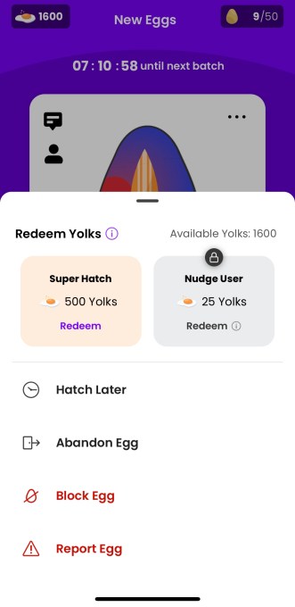 In addition to buying a selection of new potential matches, you can spend 500 Yolks to Super Hatch someone, taking after major dating apps like Hinge’s Rose, Bumble’s SuperSwipe or Tinder’s Super Like. Meanwhile, 50 Yolks allows you to Egg On a potential match and 25 Yolks lets you Nudge a person that hasn’t responded to the question yet. The Nudge feature sends the desired user a push notification.