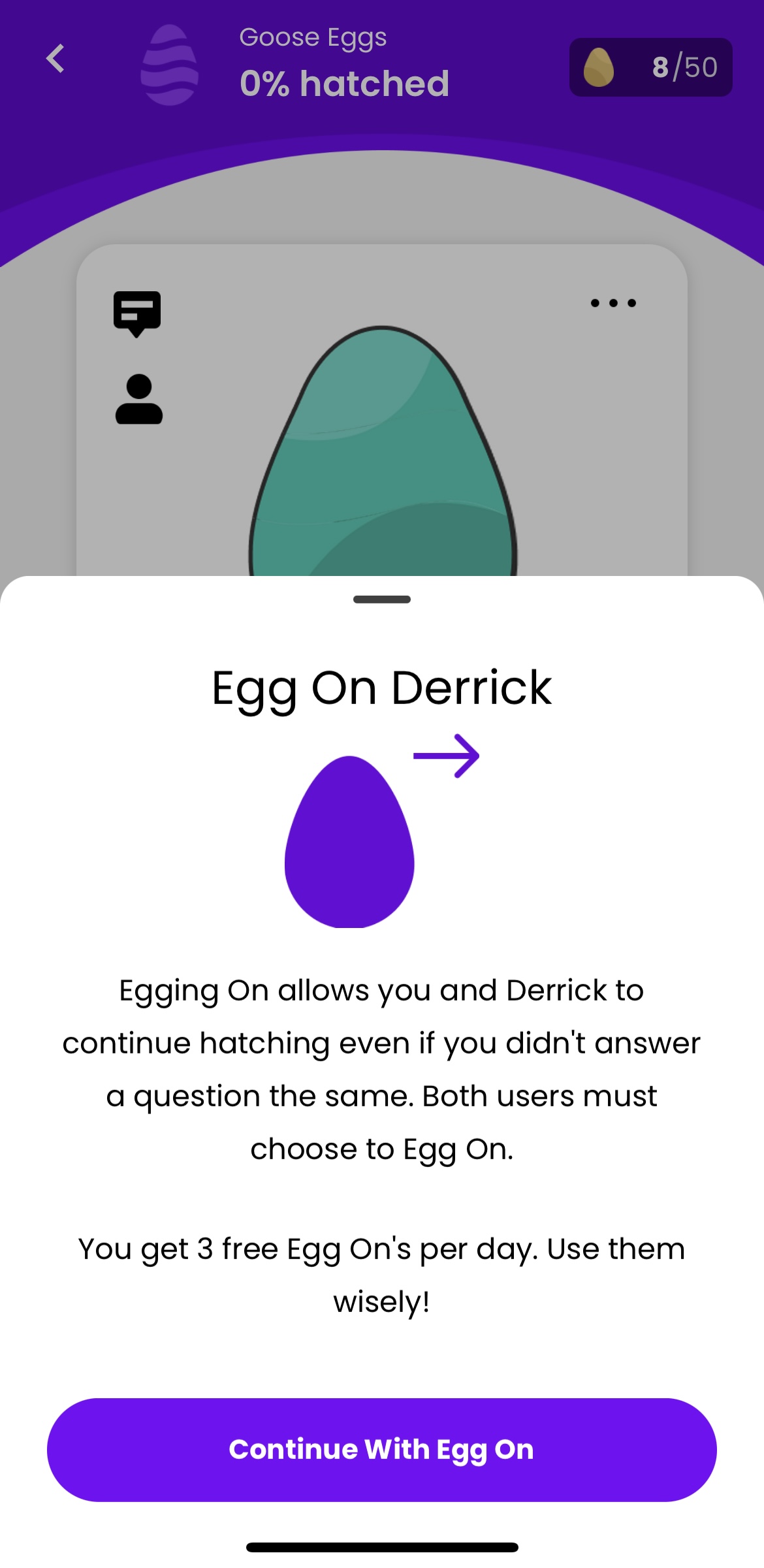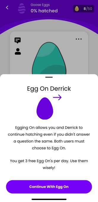 You’ll know you responded the same when the egg shakes and “cracks” open one layer. If you answer differently, the egg flashes red, indicating it likely isn’t compatible. However, if you want to try again, an “Egg On” option allows you to answer a new question in hopes of securing the match. But the other match must also select “Egg On” to continue.