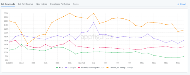 However, a third company, Appfigures, did notice a slight increase in downloads of both X and Threads, perhaps related to the OpenAI conversation. (See below).