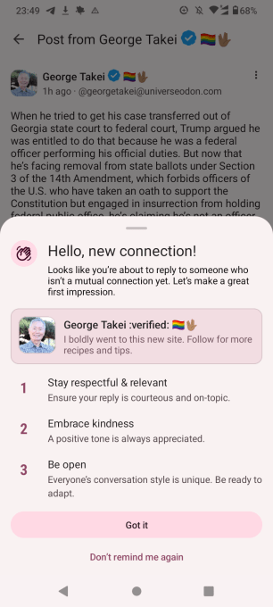 “While we’re exploring multiple different avenues to tackle this issue, the idea we’re experimenting with today is simply reminding people when they’re about to respond to a stranger,” explains Mastodon founder and CEO Eugen Rochko. “We also believe that by showing a bit of information about the person you’re about to talk to, we can prevent some awkward situations, such as explaining something to an expert in a given field.”