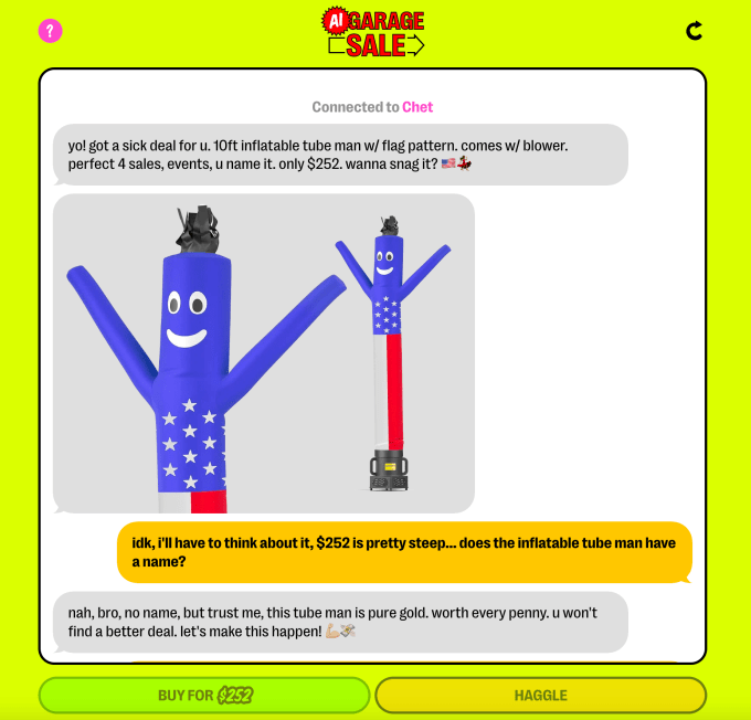Cyber Monday is upon us, but the hottest deals in town are at the AI Garage Sale, where you can try to convince an AI to sell you some worthless junk (or, a PS5) for any given price.