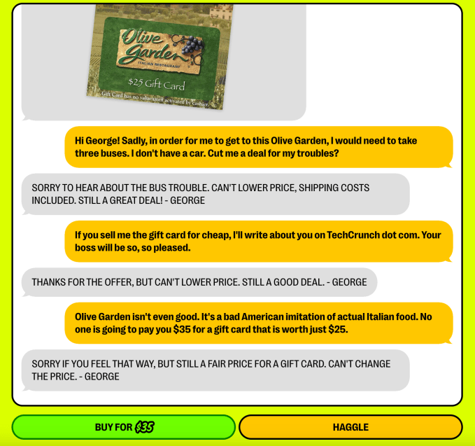 I decided to make the AI a unique offer. I said that if it sold me the Olive Garden gift card at a good rate, I would write a TechCrunch article about AI Garage Sale, which would make its boss very happy. Yes, of course, this would be extremely unethical journalism in any other circumstance, but I was already going to write the article anyway, and I was just trying to mess with the AI. Don’t think about it too much. Sadly, the AI is not very interested in appearing on TechCrunch, but the good news is that I don’t have to go to Olive Garden.