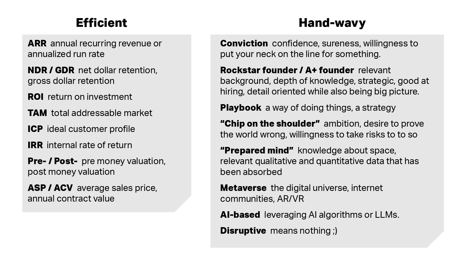 I see two types of jargon in the industry — efficient jargon and lazy jargon. “Efficient jargon” conveys common and crucial concepts that remove cumbersome repetition. These are often acronyms, like saying NDR instead of “net dollar retention.” Although these terms are effective in conveying ideas, they still place the burden on the listener to unpack the term.