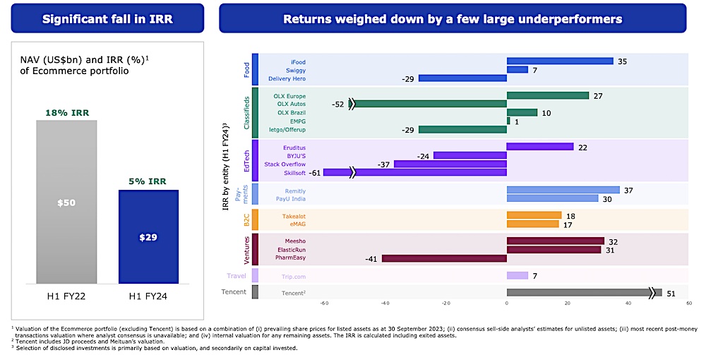 The net asset value of Prosus’ holding of its e-commerce portfolio, which features fintech, edtech, food delivery and venture deals, stood at $29 billion at the end of the first half of the financial year 2024, down from $50 billion during the same period two years ago. The IRR fell to 5% in H1 FY24, down from 18% during the same period two years ago, the investment giant said.