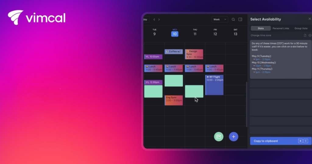Since last year, Vimcal has launched an AI-powered free-time finder, which lets you paste meeting slots shared by others in text form. You can also paste a Calendly link to let you see your free slots. The feature also automatically converts those time slots into your time zone.