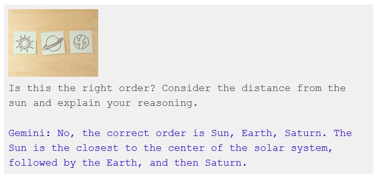 Later, three sticky notes with doodles of the sun, Saturn, and Earth are placed on the surface. “Is this the correct order?” Gemini says, “No, the correct order is Sun, Earth, Saturn.” Correct! But in the actual (again, written) prompt, the question is “Is this the right order? Consider the distance from the sun and explain your reasoning.”