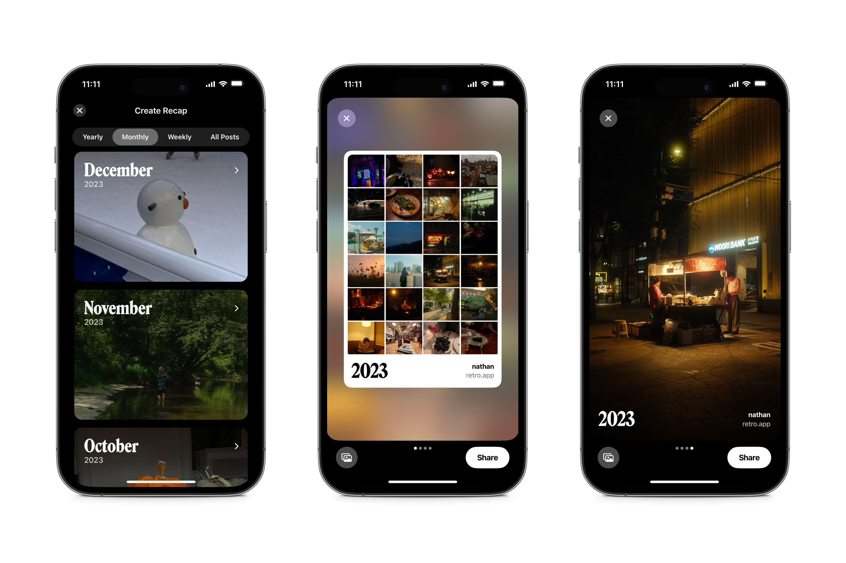 As the year is about to end, Retro users can now find a new “Recaps” button on their profile. From there, users can choose a duration — the past year, a specific month, a recent week or all their photos.