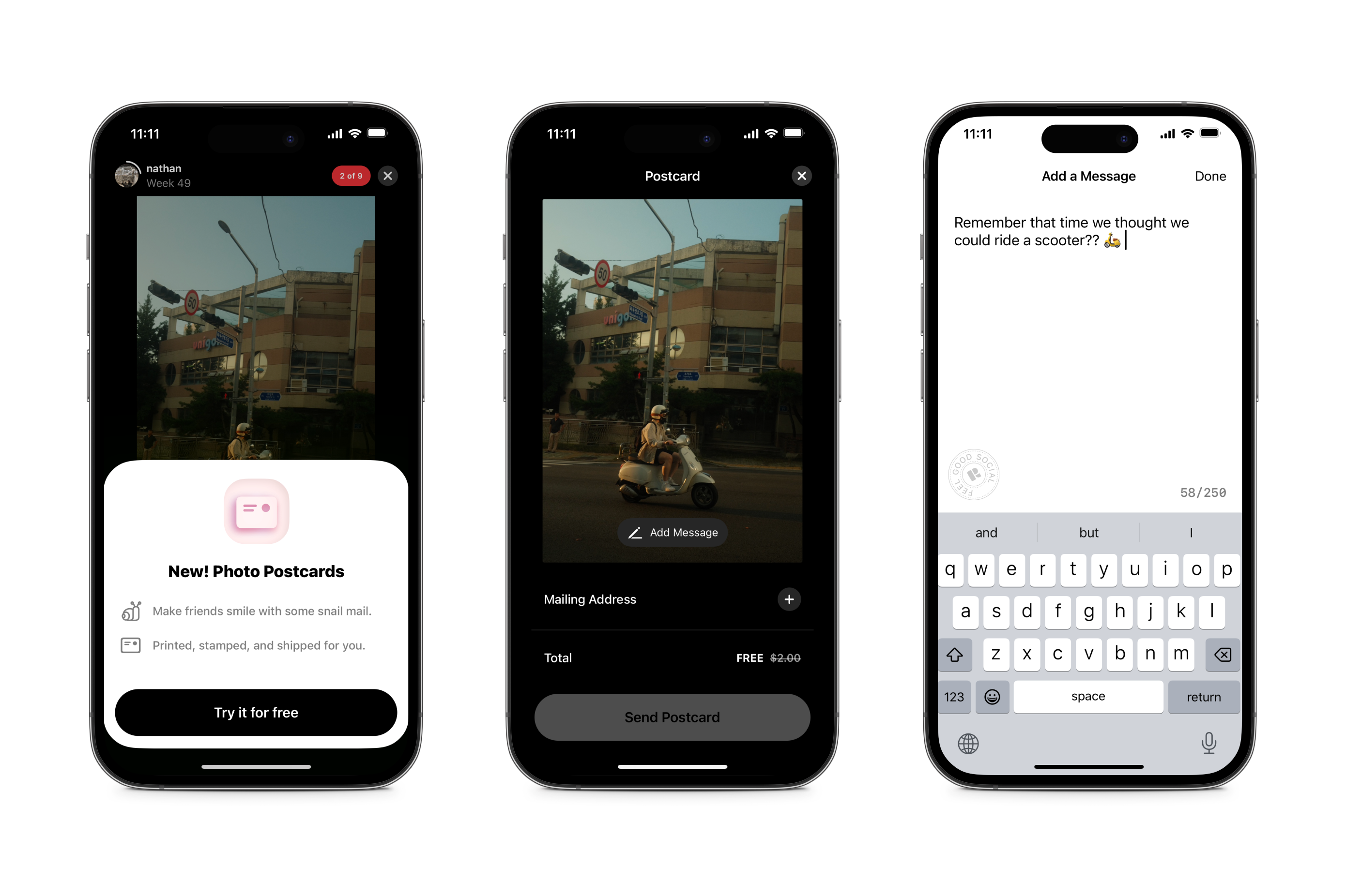 Retro also added a new button across the app in the recaps or in individual photo posts. You can now send photos as good old postcards — yes, printed postcards with a few words on the back.