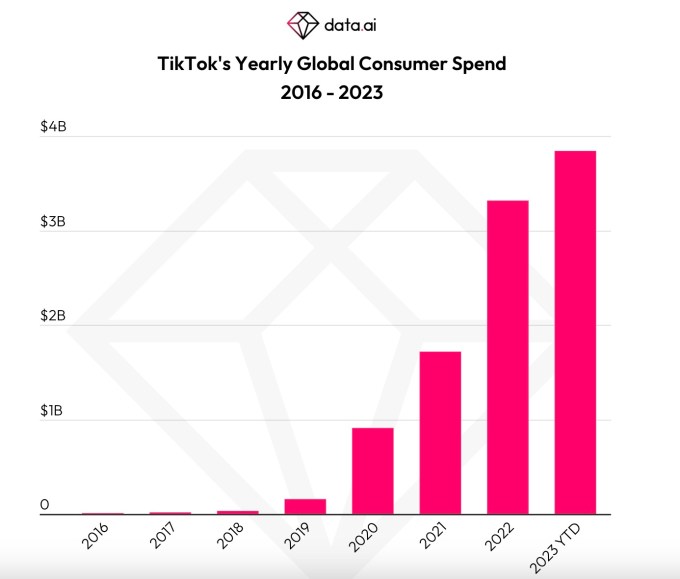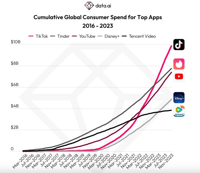 The report notes that TikTok entered 2023 with more than $6.2 billion in consumer spending already and then added another $3.8 billion throughout the course of the year, or 61% growth from the year’s start. The figure is also 15% higher than 2022’s total of $3.3 billion, data.ai says. For reference, its report includes only TikTok’s consumer spending across iOS and Google Play, not the third-party Android app stores in China. That means TikTok’s total consumer spending could be even higher.