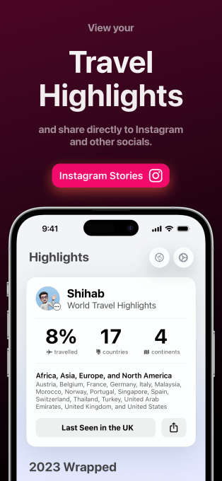 In Globetrotter, the app will show you travel highlights for both the U.S. and the world, like the percentage of the world traveled, with a breakdown of how many continents and countries were visited. There’s also a scratch map of the world where you can track the countries you’ve visited and a card of metrics that can be shared out to Instagram Stories.