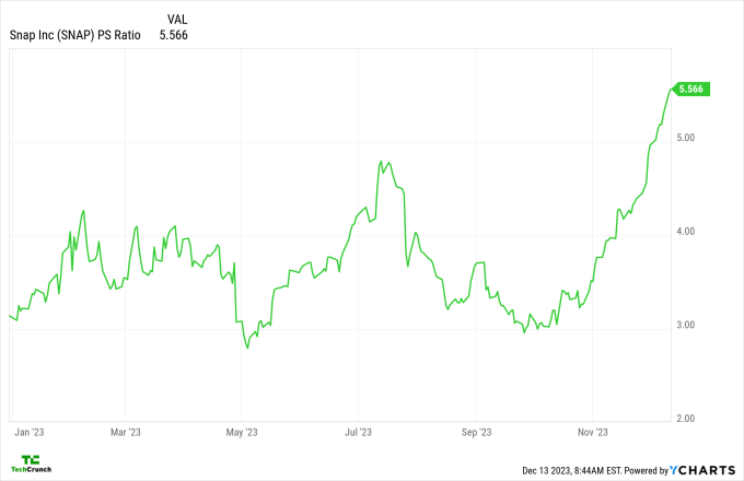 - Snap is expecting revenue to rise in Q4, while X is seemingly not: In its Q3 2023 report, Snap said it expects Q4 revenue to land between $1.32 billion and $1.375 billion. That’s a nice bump from its Q3 revenue of $1.19 billion. In contrast, the Bloomberg report cites sources as saying that X will report a “similar performance” to its other quarterly results this year. That implies X’s revenue may be increasing at a slower clip than Snap’s, which means the company is therefore not likely going to warrant a similar price/sales multiple.