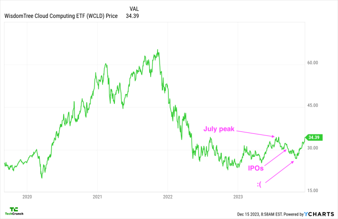 This ETF (exchange-traded fund) we’re looking at tracks the performance of the Bessemer cloud index that this column has long used as a point of reference. Basically, cloud valuations peaked this year in July; then Arm, Klaviyo and Instacart filed for their IPOs in August, and they went public in September. Subsequently, cloud stocks declined, which made it unpalatable for other companies to try their own luck at the public markets.