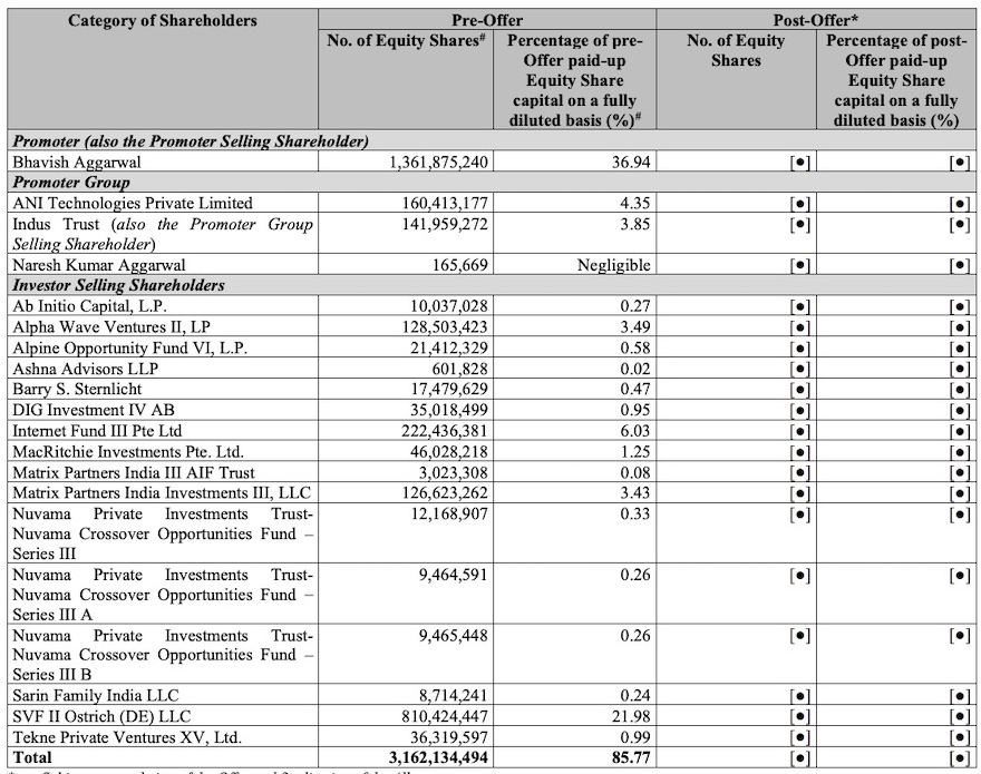 The startup also plans to sell roughly 95.2 million shares from existing investors and shareholders, including some of those from founder Bhavish Aggarwal (pictured above), Alpha Wave Ventures, Tiger Global, Matrix Partners and SoftBank, according to the draft prospectus. Kotak, Citi, Bank of America, Goldman Sachs, Axis, ICICI, SBI and BOB Capital are running the book for the IPO, according to the prospectus.