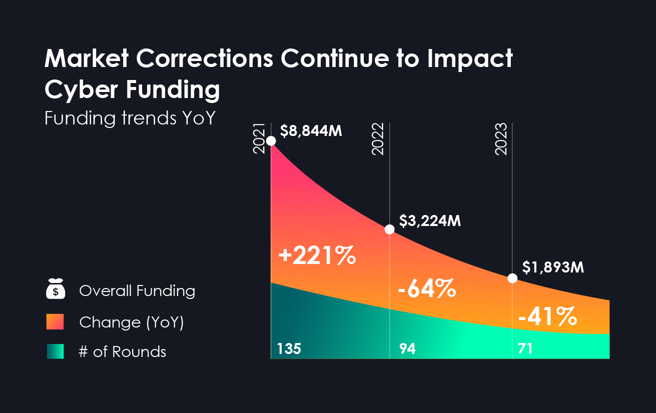 In 2023, the overall decline in tech investments continued, with total funding of Israeli cybersecurity startups reaching only $1.89 billion across 71 funding rounds, down 41% from 2022’s total — $3.22 billion across 94 funding rounds. “In 2021, the irrational exuberance in the financial markets led to inflated valuations across the startup landscape, including cyber,” remarks Erica Brescia, managing director at Redpoint Ventures. “What we’re witnessing now is not a slowdown, but rather a return to pre-pandemic sanity — a market correction that paves the way for healthier startups.”