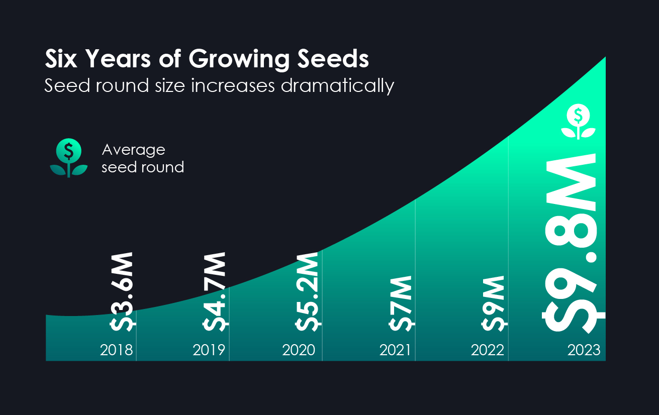 Unlike overall funding trends, there was a significant increase in the average seed round for the sixth consecutive year, from $9 million in 2022 to a record $9.8 million in 2023. This can be attributed to the constant and growing need for groundbreaking security solutions to resolve unrelenting security issues and sustained investor appetite for supporting innovative founding teams able to do so. While the average seed amount grew, the number of seed rounds in 2023 was only 36, down from 46 in 2022.