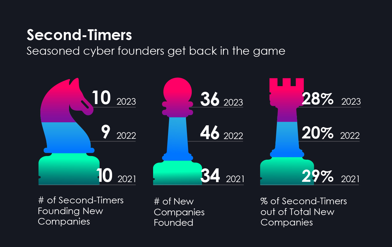 We noticed this budding trend in 2022 when nine cybersecurity startups were founded with second-time founders at the helm. In 2023, the number of serial entrepreneurs who raised seed rounds increased back to 10, after a slight dip in 2022, most still in stealth mode. This year, however, these seasoned entrepreneurs had a larger share of the seed pool than in 2022.