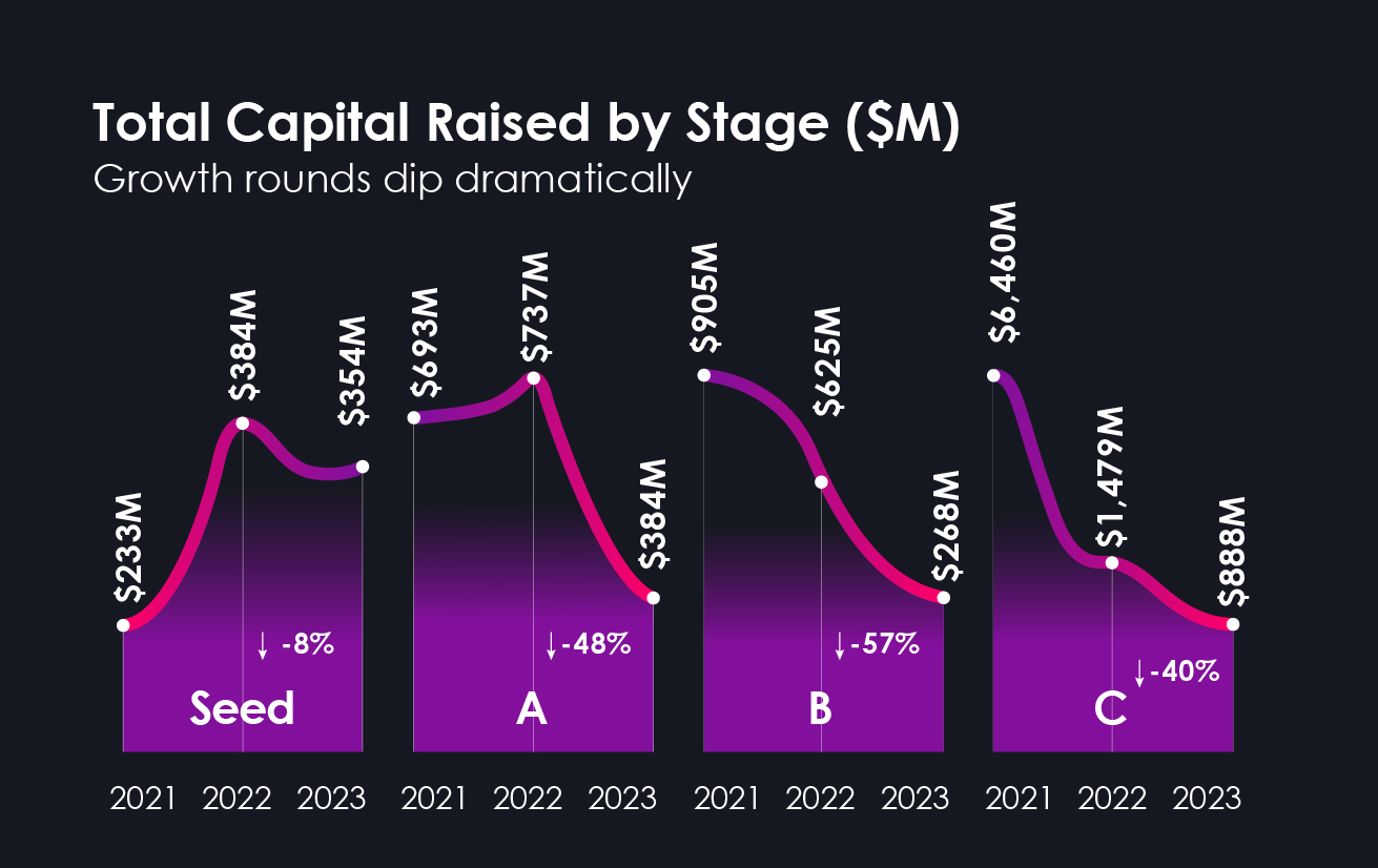 Total capital raised in Series A, B, and C rounds dropped across the board in 2023 when compared to 2022’s numbers: Series A — from $737 million in 2022 to $384 million in 2023; Series B — from $625 million in 2022 to $268 million in 2023; and Series C and onward — from $1.48 billion in 2022 to $888 million in 2023, a 40% decrease in total capital at this stage. Notable rounds in 2023 include Gem Security‘s $23 million Series A round led by GGV Capital; Grip Security‘s* $41 million Series B round led by Third Point Ventures; Island‘s $100 million Series C round led by Prysm Capital; Wiz‘s $300 million Series D round led by Greenoaks, Index Ventures and Lightspeed Venture Partners; and Cato Networks‘ $238 million Series G round led by Lightspeed Venture Partners. While investors remained optimistic about new spaces and startups in the earliest stages, they were more hesitant to invest in companies that raised capital at unhealthy valuations in 2021 and needed a significant influx of capital in 2023 to extend their runway.