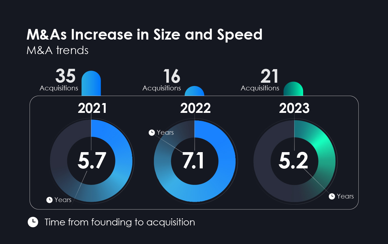 The combination of this shift toward consolidation and the realization that acquisition is the only option for several startups led to an interesting decline in the average number of years it took to reach an exit. In 2022, it took startups an average of 7.1 years from founding to acquisition, while in 2023, the average dropped to only 5.2 years, even lower than 2021’s average of 5.7 years.