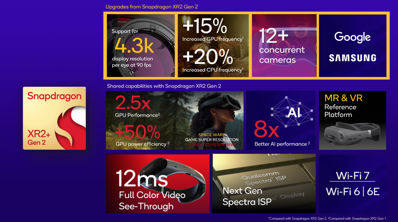 Throughout the last few years, Qualcomm built out its overall AR/VR/XR platform. These include the Snapdragon AR chips, which, for example, power the Meta/Ray-Ban smart glasses. The lineup is a bit complicated, with the AR1 Gen 1 meant for smart glasses without a screen, the AR2 Gen 1 chips for AR-enabled smart glasses, as well as the XR1 and XR2 chips. The XR2+ Gen 2 is the new flagship of the series, besting the previously released non-plus XR2 Gen 2, which “only” provided a 3K resolution. Like before, Qualcomm will keep the existing chips in production.