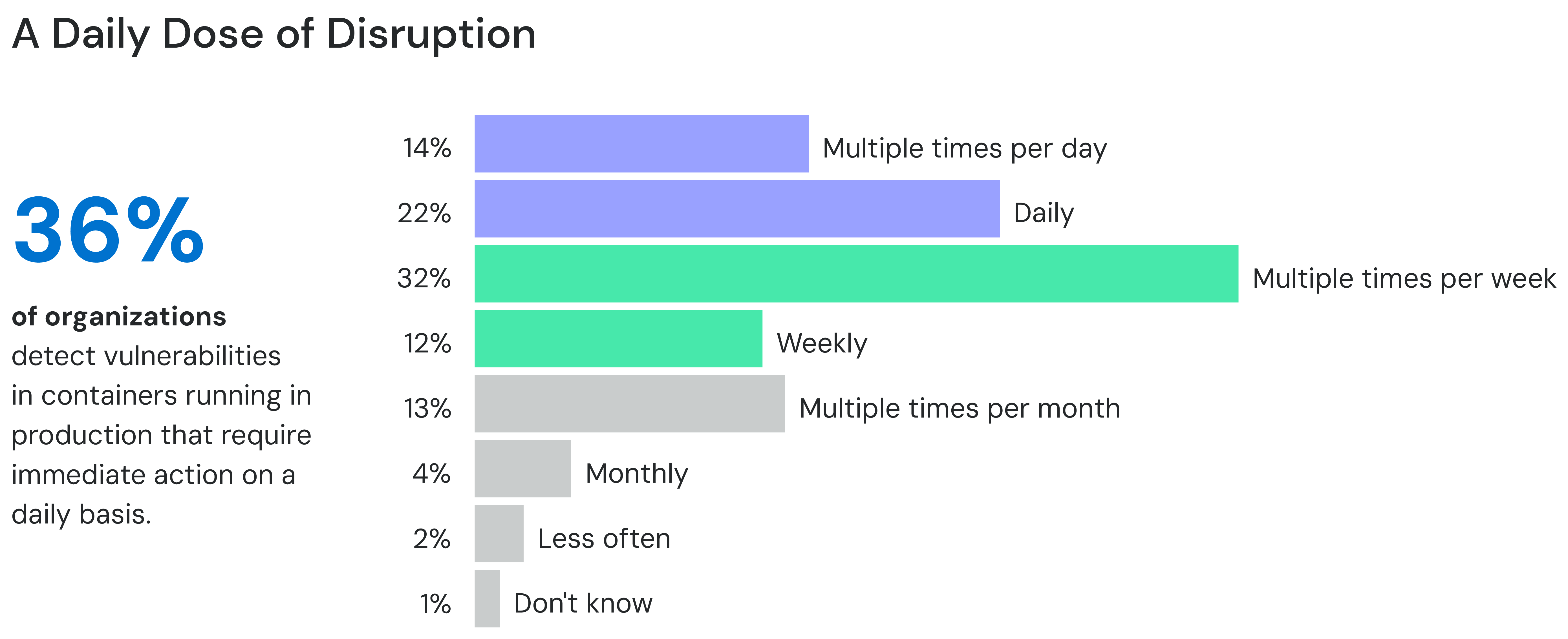 All of this inevitably leads to inefficiencies. The majority of organizations that responded to the survey said they employ six or more specialists who focus on vulnerability remediation (with a quarter of respondents employing more than 10). One of the major problems in the industry is that more than 40% of the alerts these teams get are false positives — often for libraries that may be part of a container but aren’t used in production. Because of this, Kaya for example greatly advocates for creating minimal container images. One could argue that this should be a best practice anyway, since it creates a smaller attack surface and reduces false positives.