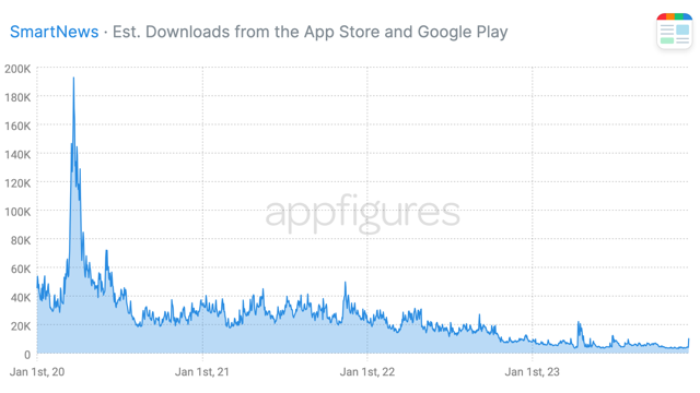 But per estimates from Appfigures, SmartNews’ daily downloads have dropped by half since January of this year and less than a quarter of the number of daily downloads it had in 2022. The firm’s analysis shows that since 2020, SmartNews has seen a total of roughly 45 million total installs. Given the decline in downloads, Apptopia said a figure of 10 million active users today would now be “a stretch.”
