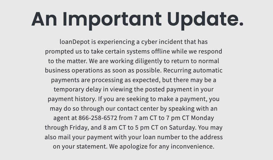 LoanDepot says it has millions of customers, according to its investor website. Portions of LoanDepot’s website, including its customer portals, appear to be non-functional. One error message on a login page seen by TechCrunch tells users: “Recurring automatic payments are processing as expected, but there may be a temporary delay in viewing the posted payment in your payment history. If you are seeking to make a payment, you may do so through our contact center by speaking with an agent at 866-258-6572.”