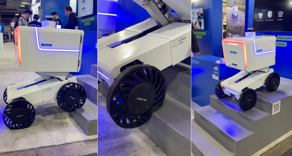 One of the easiest shots to take at the delivery bots some of us see trundling around techy cities is that they can’t climb stairs, curbs, or any other minor obstacle that even a slug could handle. Mobinn, a new spinoff from Hyundai, has seemingly solved this using a set of flexible wheels that can take it up stairs with ease. They showed off their delivery bot at CES 2024 in Las Vegas.