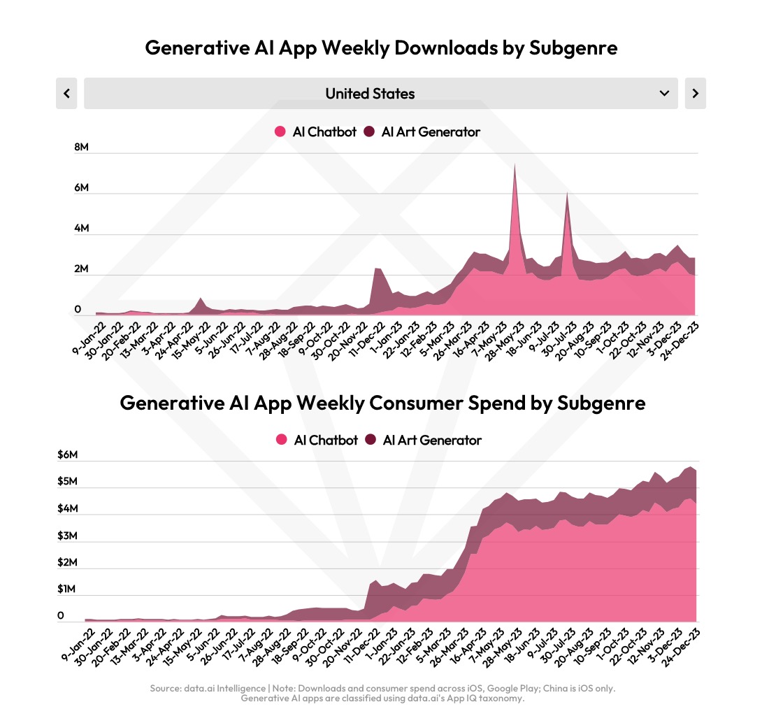 The firm also cited generative AI advances as helping to fuel consumer spending last year. The GenAI app market expanded by 7x, leading to new consumer experiences like AI chatbots and AI art generators. Top apps included ChatGPT, Ask AI and Open Chat, in terms of consumer spend. Data.ai noted that AI app popularity was “fairly global,” but the genre didn’t rank among the breakout genres in China, Japan, Saudi Arabia and Turkey.