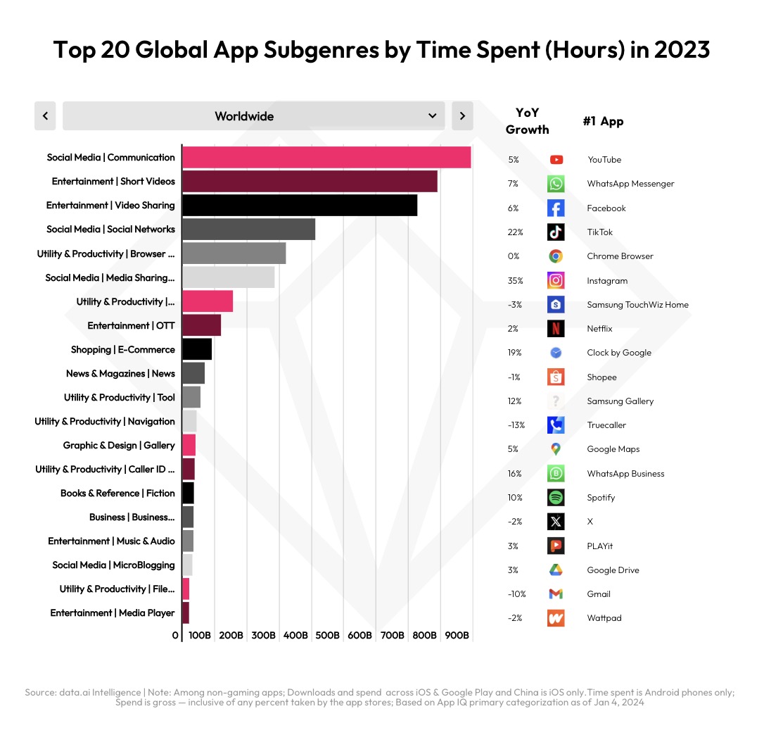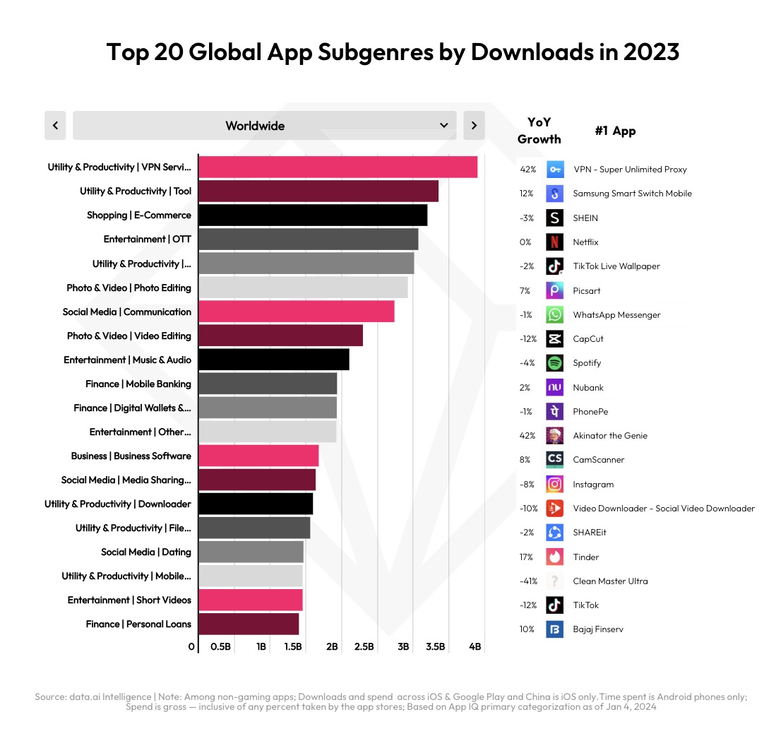 Other 2023 trends saw Chinese shopping apps like Temu and Shein growing 140% as they reached Western markets, while social and entertainment apps’ time spent grew 12% to 3 trillion hours. The latter also saw spending grow 10% to $29 billion.