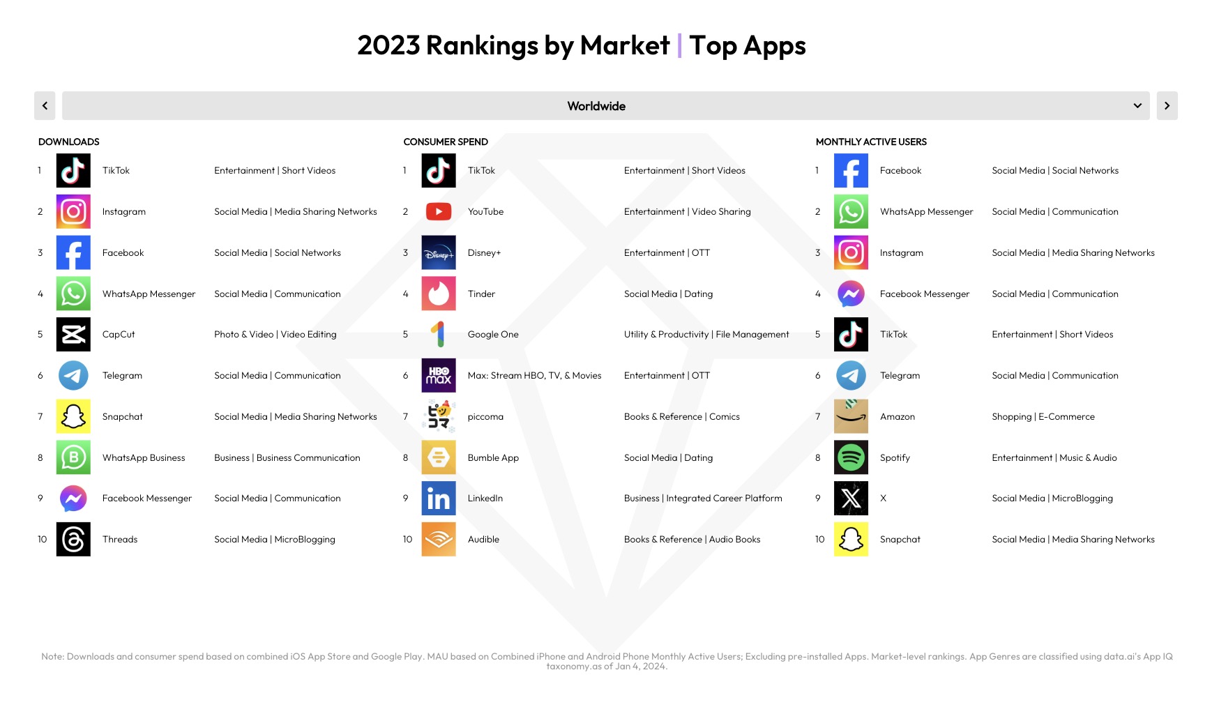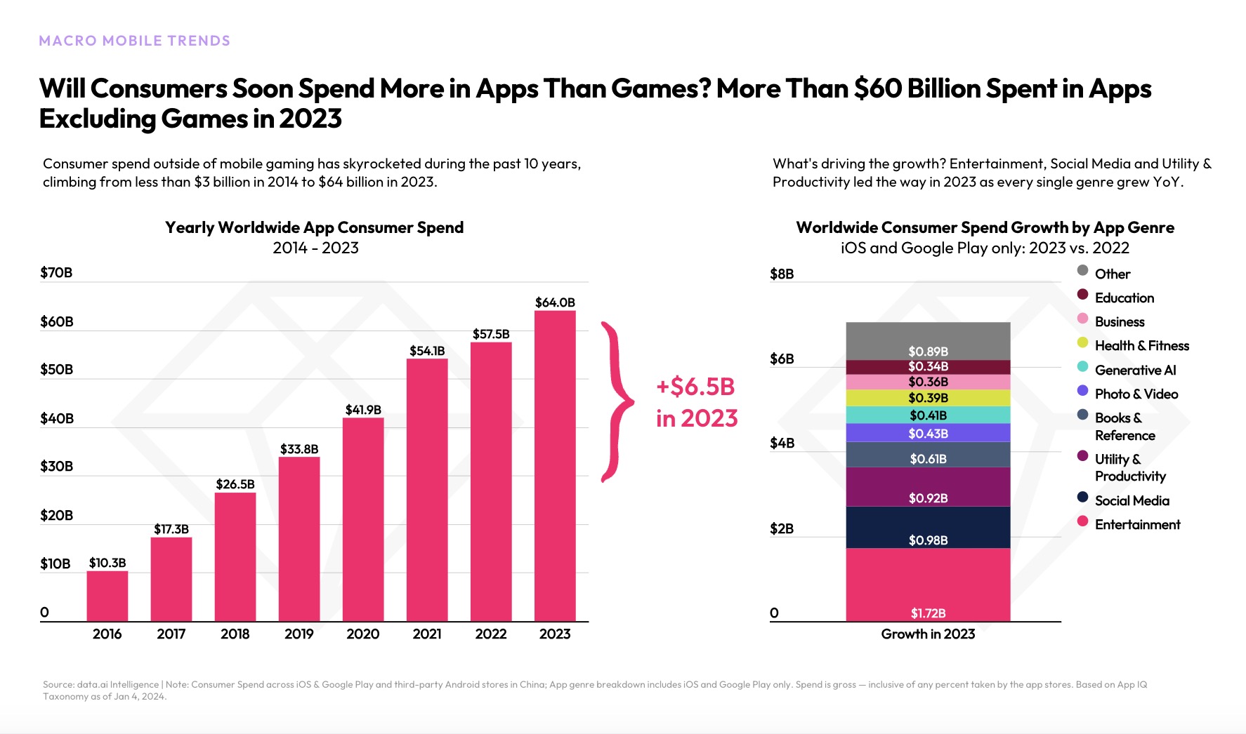 Consumer spending on non-game apps grew 11% year-over-year in 2023 to reach $64 billion. Social apps and the creator economy drove this growth with TikTok helping to lead the way. Last year, the short-form video app hit a new milestone of more than $10 billion in lifetime spending, for instance, becoming the first non-game app to do so. This year, data.ai predicts that consumer monetization in social apps will grow 150% to $1.3 billion.