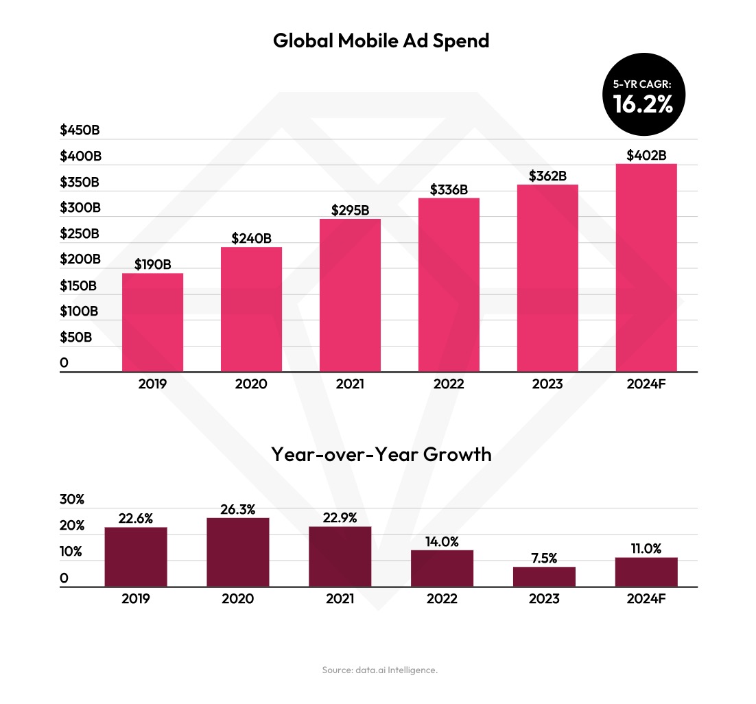 Data.ai also reported hours spent peaked at 5.1 trillion, up 6% year-over-year, while mobile ad spending is projected to reach $362 billion this year, up 8%. The forecast for 2024 will see a larger jump of 16.2% to reach $402 billion, data.ai estimates, as ad spending bounces back from slower growth in 2023.