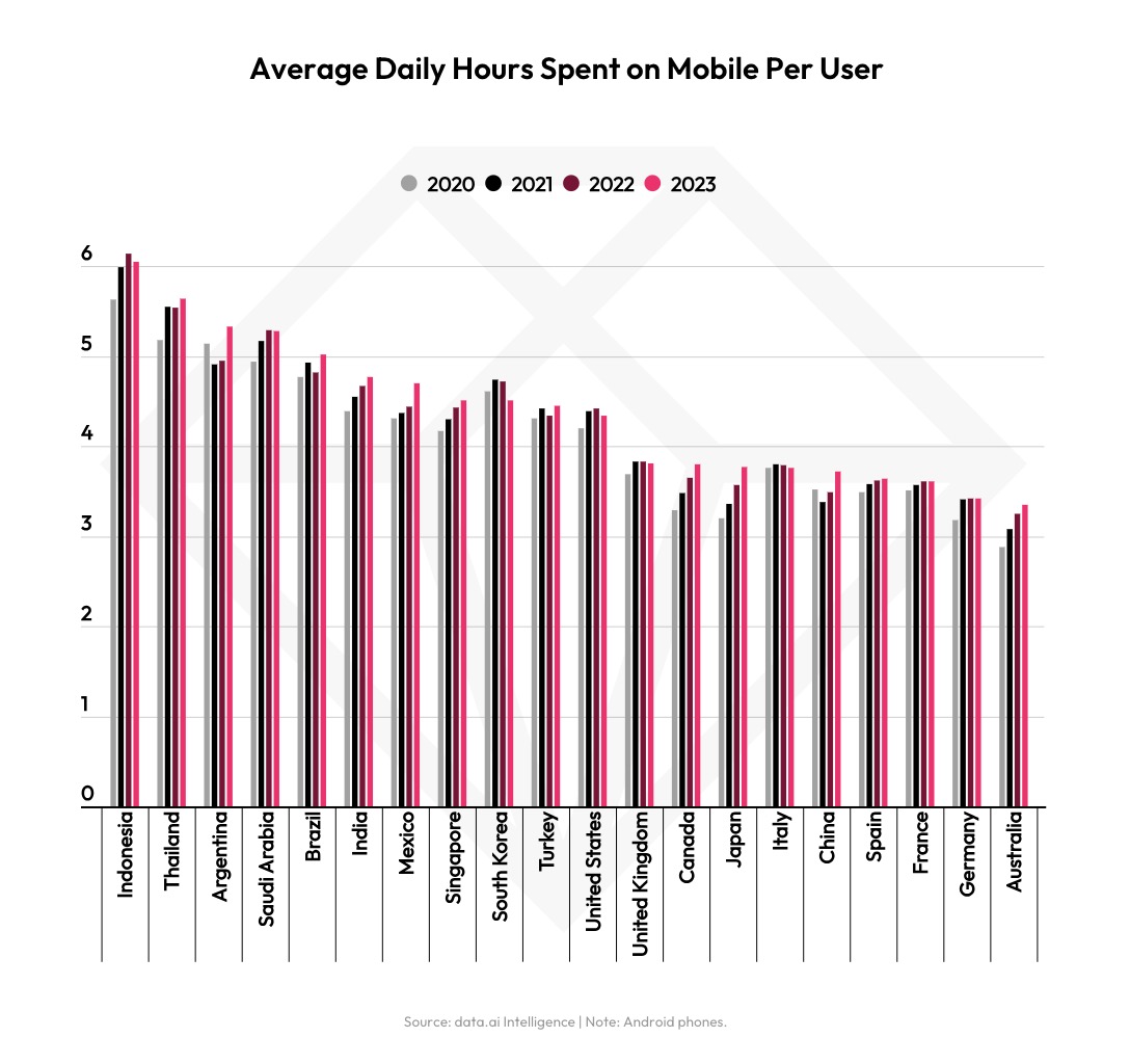 Meanwhile, across 10 top markets, the average daily hours spent on mobile per user grew 6% from 2022 to reach more than five hours. Here, apps like YouTube, WhatsApp, Facebook, TikTok, Chrome, Instagram, Netflix and others helped boost time spent.