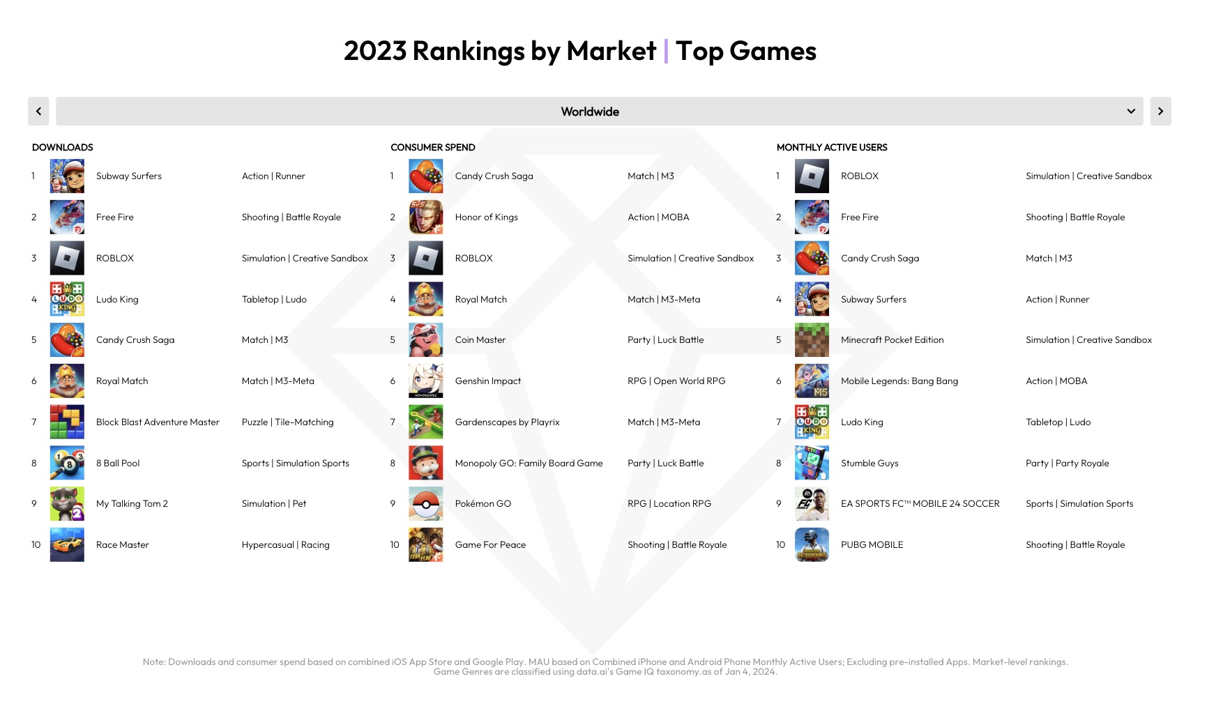 Worldwide, the top app by installs and spending was TikTok, but Facebook remained No. 1 by time spent. The top games were Subway Surfers (downloads), Candy Crush Saga (spending) and Roblox (monthly active users).
