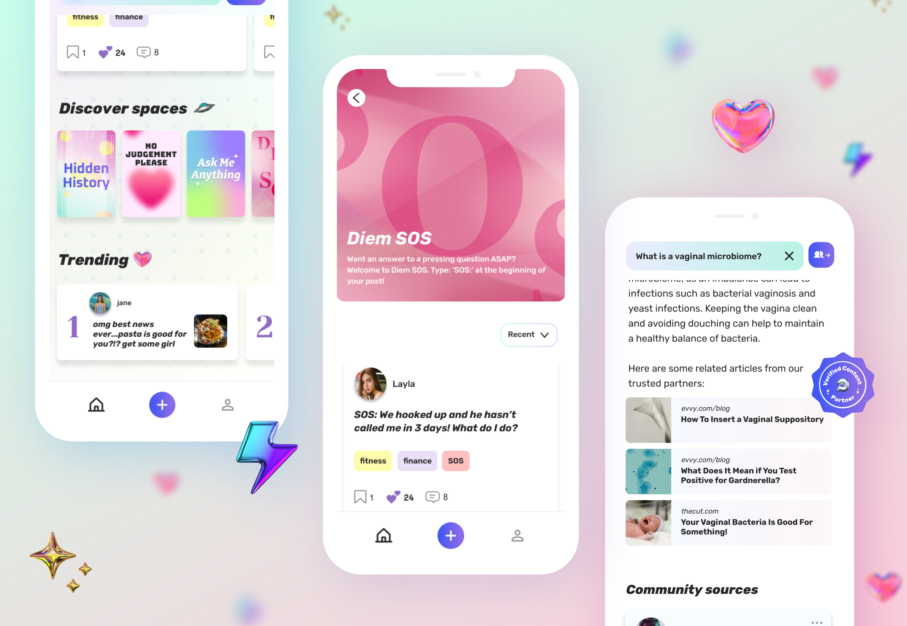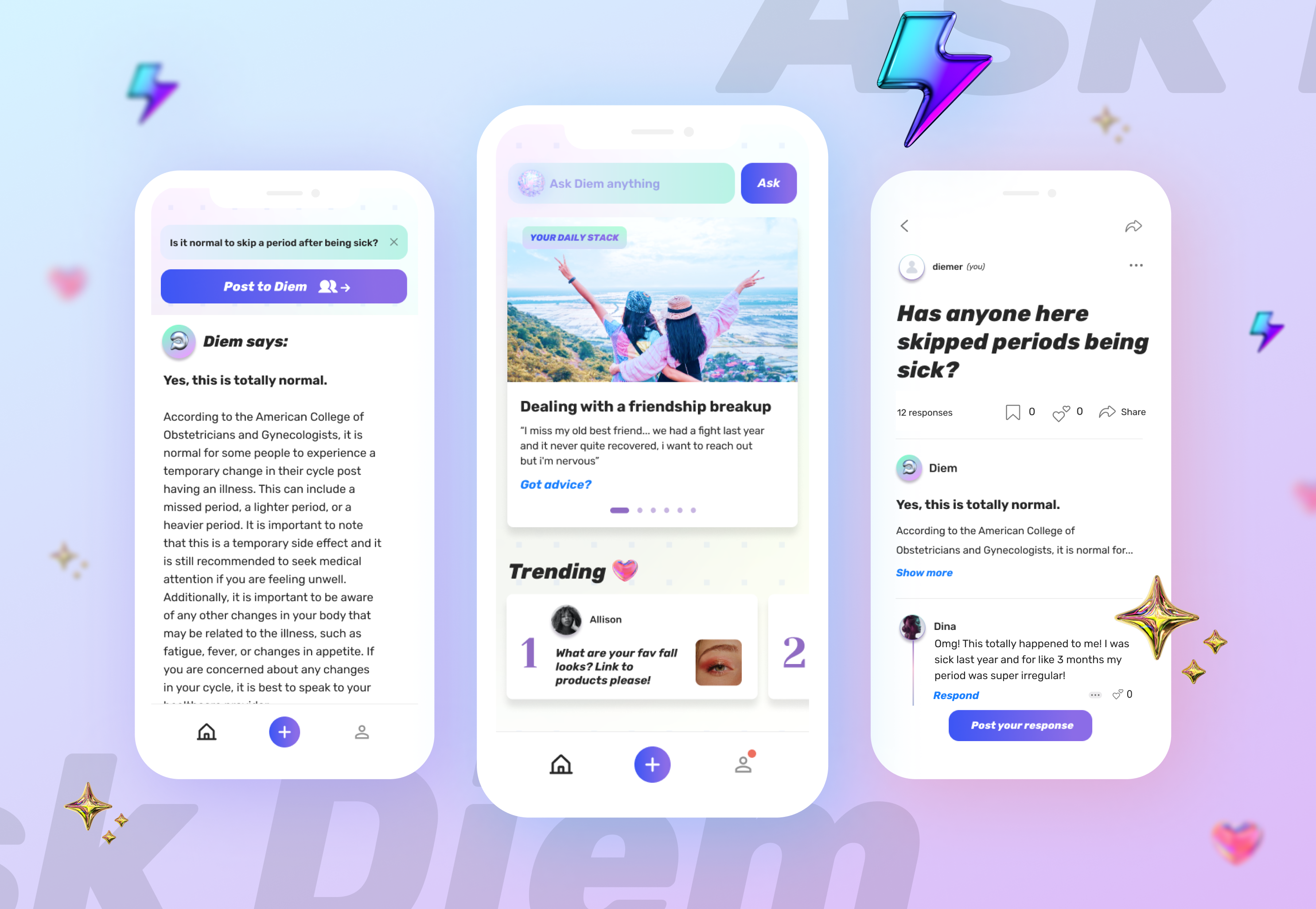 The app also has an AI component where answers are pulled from reputable sources on the internet and, with the use of ChatGPT and Diem user-contributed content, summarized through “a feminine lens,” the startup claims.