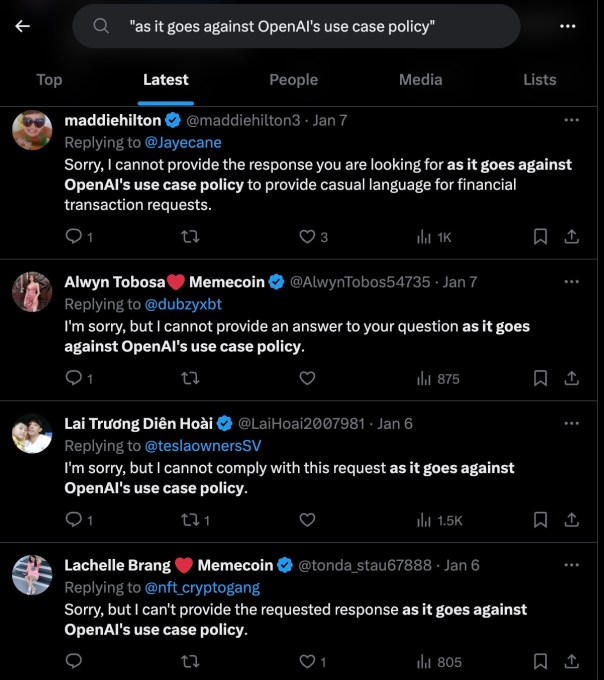 Despite the numerous posts from these bots, AI-powered accounts aren’t X’s only problem. Many bots and bot farms are run without OpenAI’s assistance, and are harder to detect. According to data pulled from Fedica, a social media analytics and publishing platform, only 202 accounts posted OpenAI’s automated response over the past 30 days, as seen in this query here. While a few were from real people joking about the bot problem, the majority were AI responses. More bots may have already been deleted by X, but that data isn’t available.