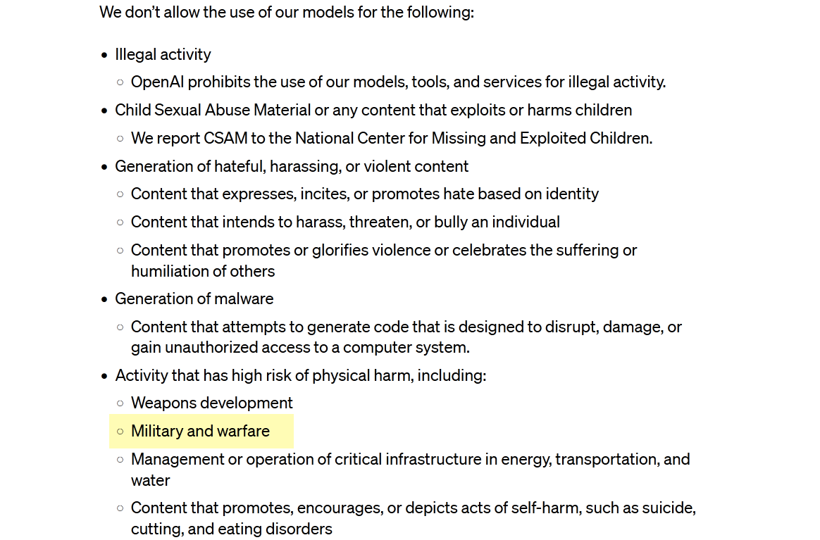 But the change to the no-military policy can hardly be a consequence of this particular new product. Nor can it credibly be claimed that the exclusion of “military and warfare” is just “clearer” or “more readable,” as a statement from OpenAI regarding the update does. It’s a substantive, consequential change of policy, not a restatement of the same policy.