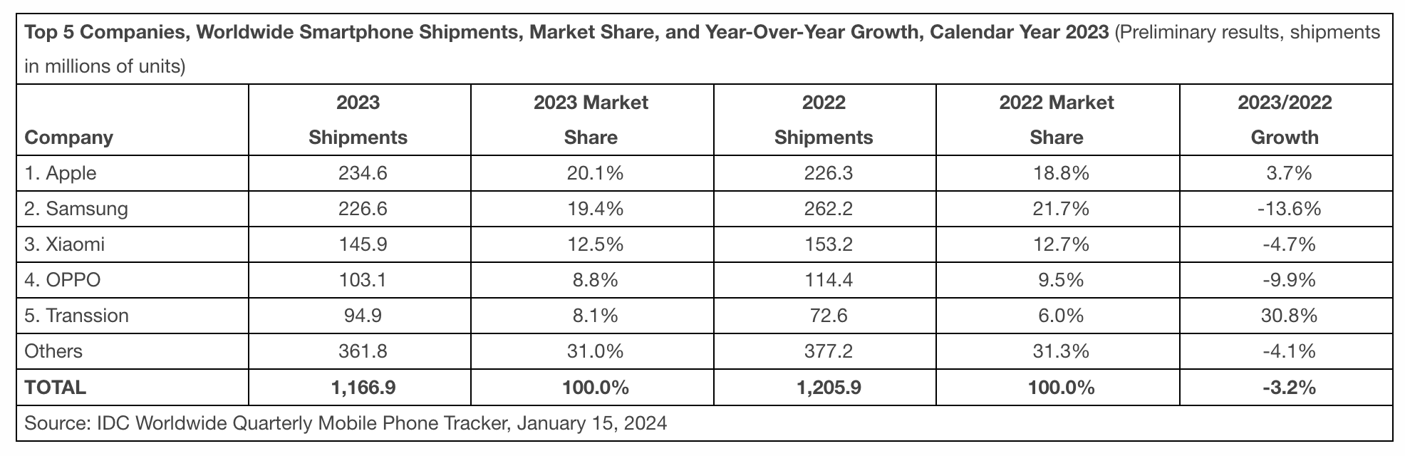 “While we saw some strong growth from low-end Android players like Transsion and Xiaomi in the second half of 2023, stemming from rapid growth in emerging markets, the biggest winner is clearly Apple,” said Nabila Popal, research director with IDC’s Worldwide Tracker team, in a press release. “Not only is Apple the only player in the Top 3 to show positive growth annually, but also bags the number 1 spot annually for the first time ever.”