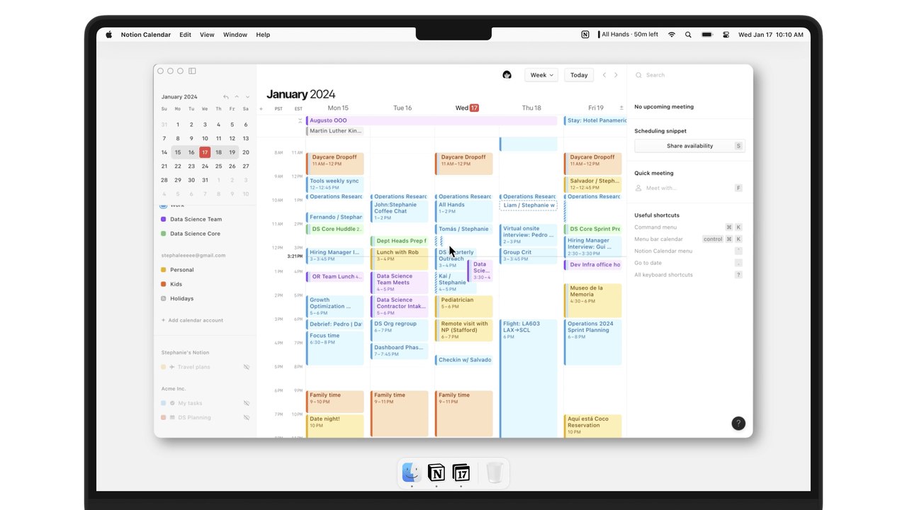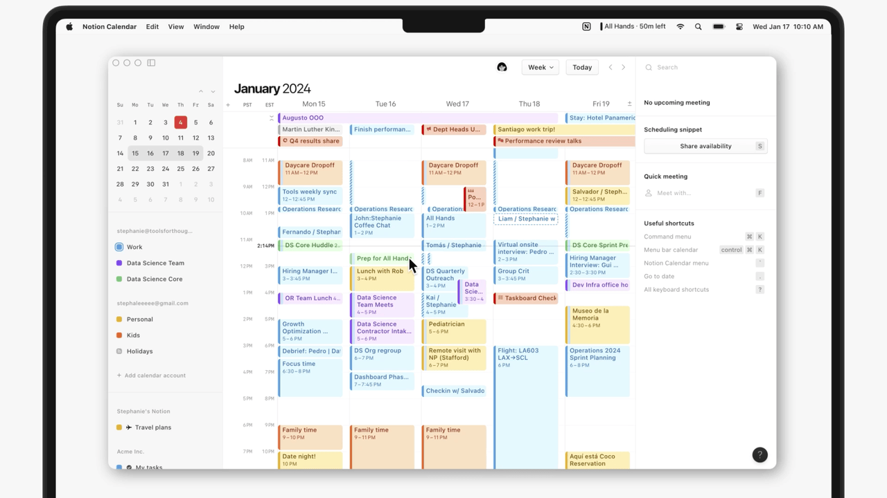 One of the niftiest features, though, is the ability to use Notion Calendar as a replacement for a scheduling service like Calendly. The feature set here is still a bit basic, but the Notion team is only getting started. Unlike Calendly, you can’t set up recurring schedules, for example, but I haven’t found that to be an issue. Instead, you simply click on “share availability” and drag and drop the times you want to make available for this meeting in your calendar. Now, there is always a weird power dynamic at play with services like Calendly, so I like the fact that Notion Calendar can also simply give you a written version of your availability [“Would 30 min anytime today Wed Jan 17, 10:30 AM – 12 PM (PST) work for you?”] that you can then copy into an email — all while the calendar app itself put a hold on those times. It’s simple, but it works.