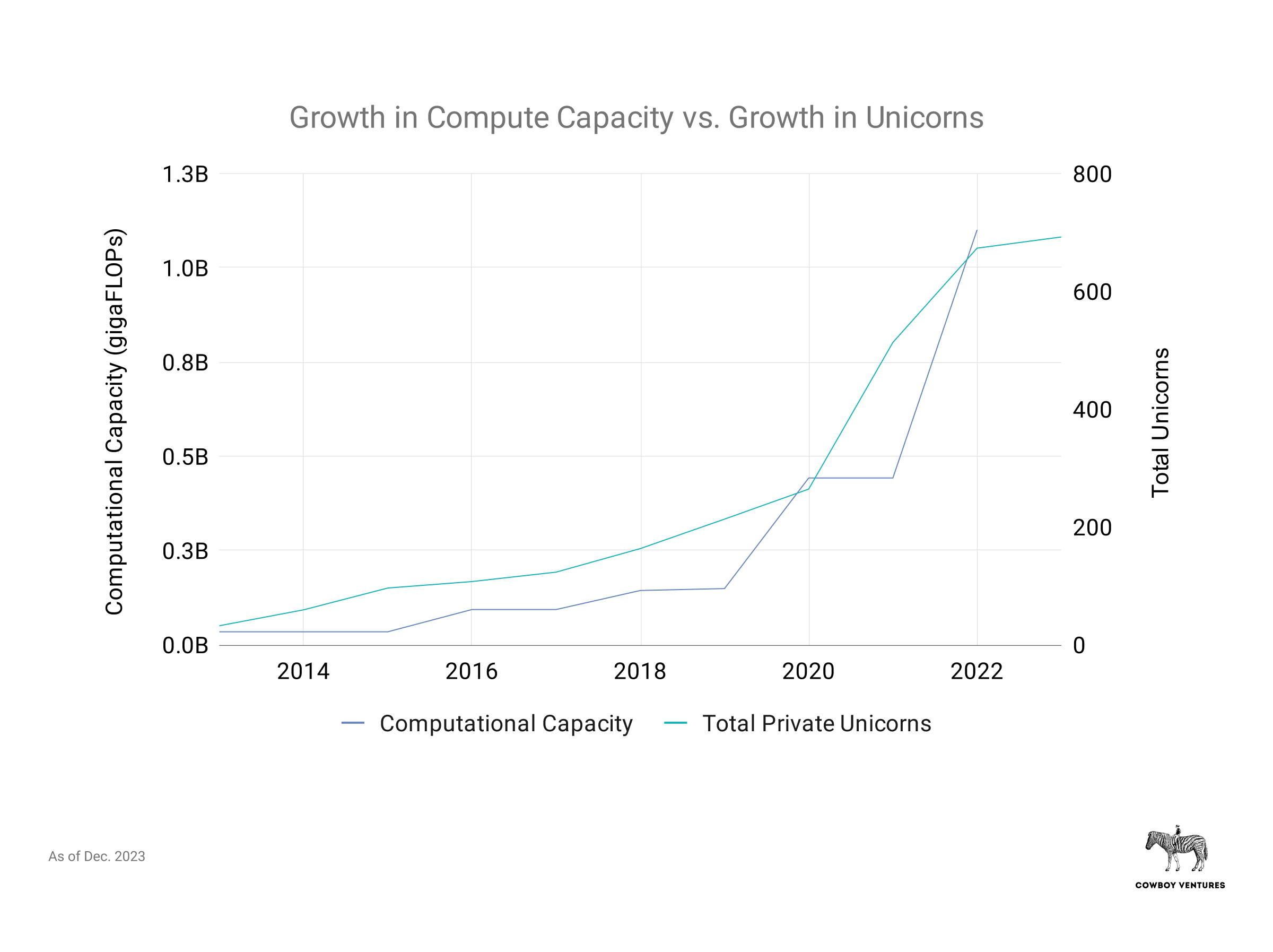 We see an echo of Moore’s law here: As compute capacity, capability and usage increase, the number of unicorns increases. The current momentum in AI should add fuel to innovation and demand.