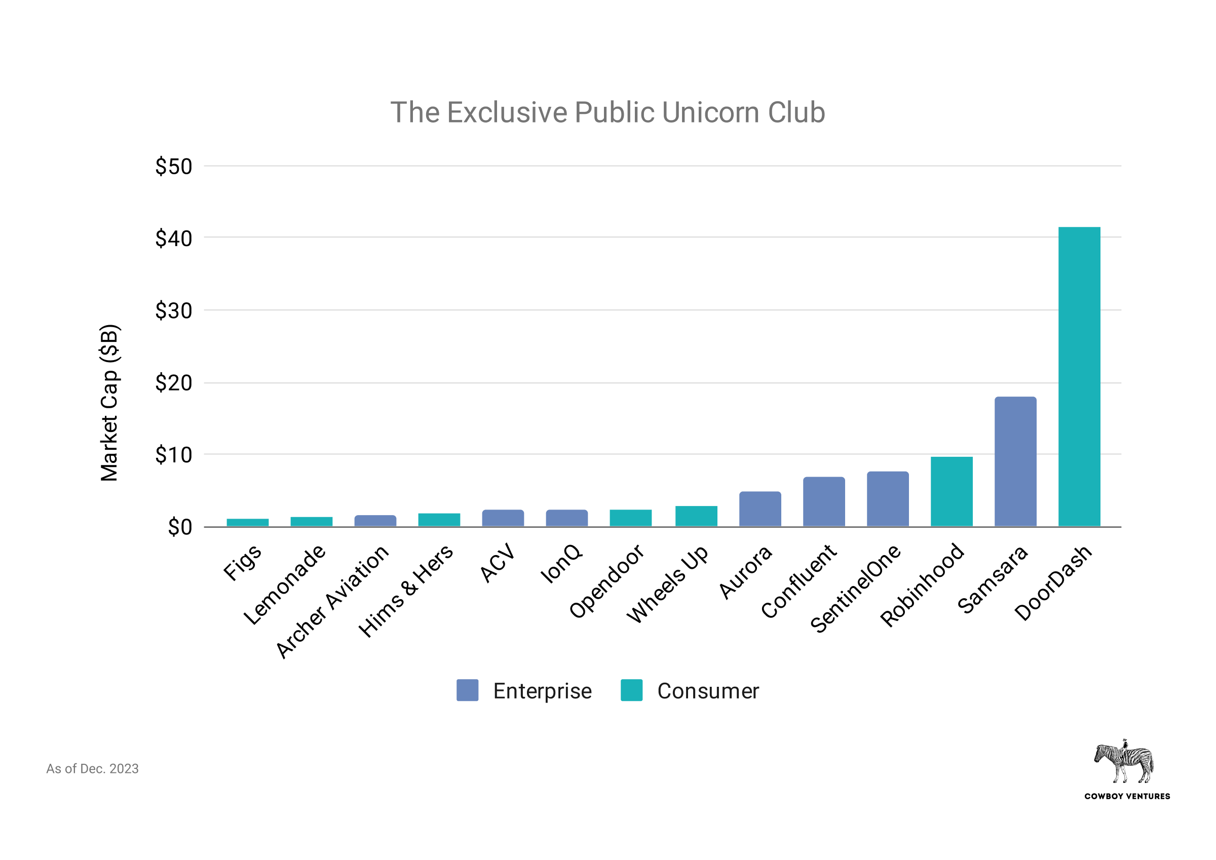 The public unicorn club is elite, with just 3% public compared to 41% going public the decade prior. That’s a huge change, partly driven by the availability of so much private capital and investors willing to invest in richer-than-public valuations in the last decade.