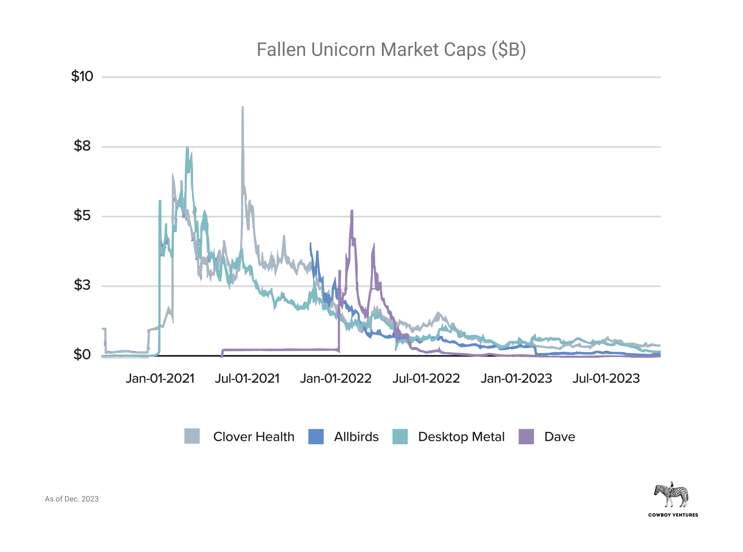 Given the chilly current M&A environment, founders’ resistance to recapitalization, and investors’ fear of “catching a falling knife” by investing in a down round, we expect more abrupt shutdowns in 2024 (e.g., Convoy, Olive Health, Zume) (“unicorpses,” anyone?).