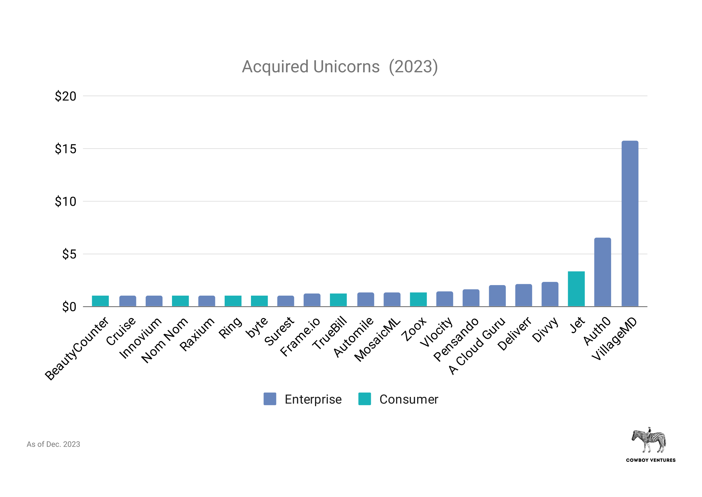 Just 21 companies were acquired, spanning a diverse set of sectors: Two-thirds were in enterprise and the rest consumer. The average acquisition price was $2.4 billion, about 2x that of 2013. Notably, 33% of these deals involved hardware companies (Cruise, Raxium, Ring, Zoox, etc.), likely a consequence of low interest rates for both unicorns and acquirers.