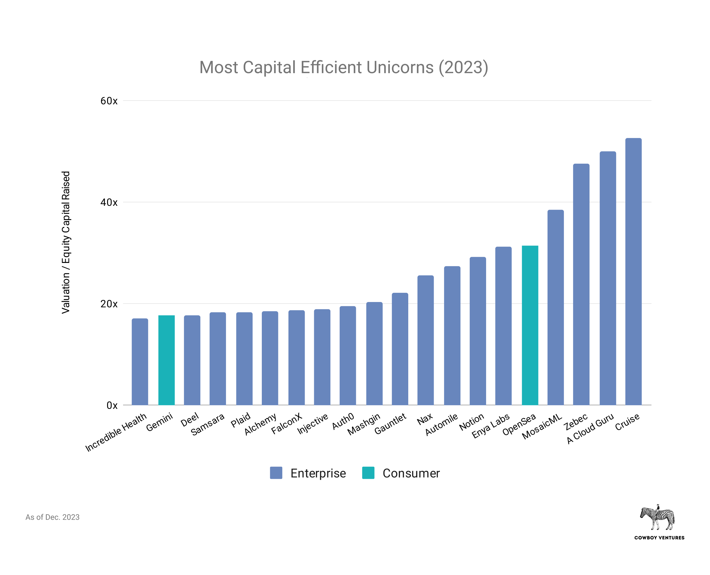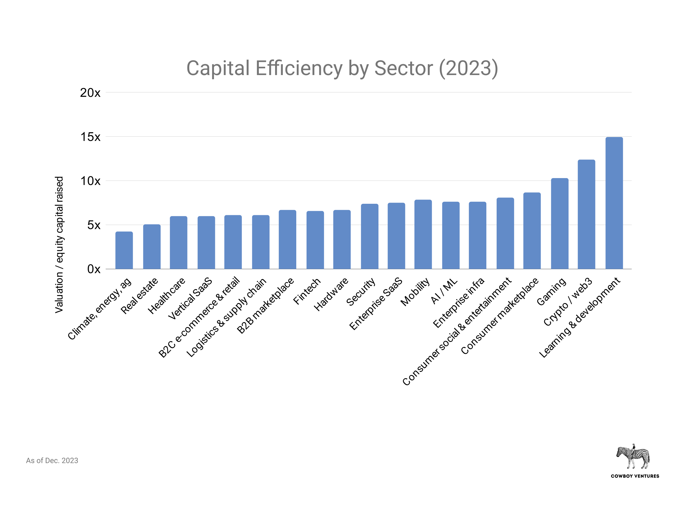 - Enterprise-oriented companies had 26x capital efficiency (current valuation divided by private capital raised), which was 2.4x better than consumer companies.