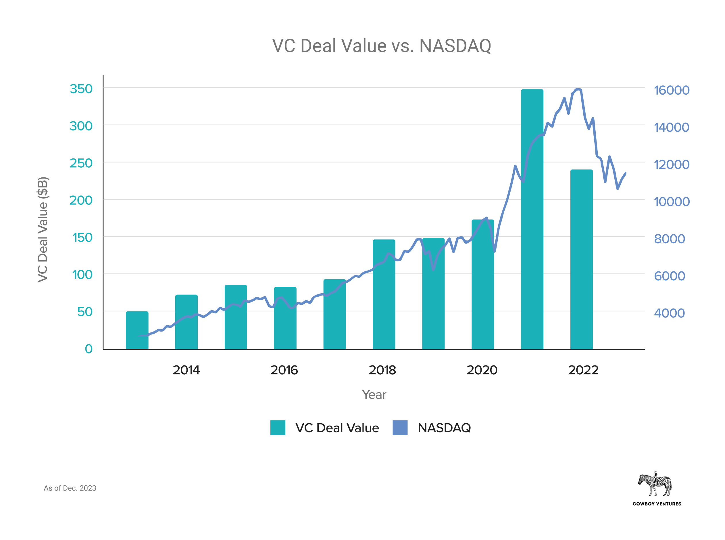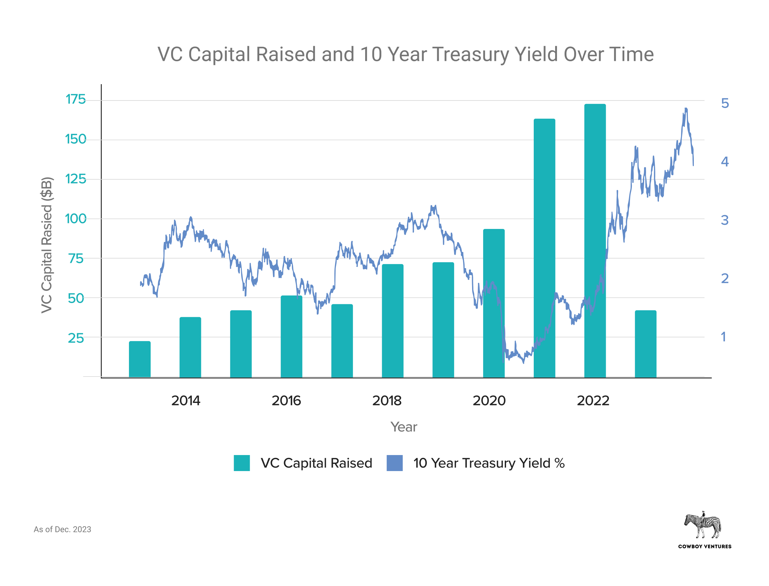 Interest rates again had a big impact here: As rates fell, investors maintained confidence in historical venture returns, while competition grew for allocation in hot deals. This caused many to overlook valuations, business model margins, payback periods and burn rates as they invested.