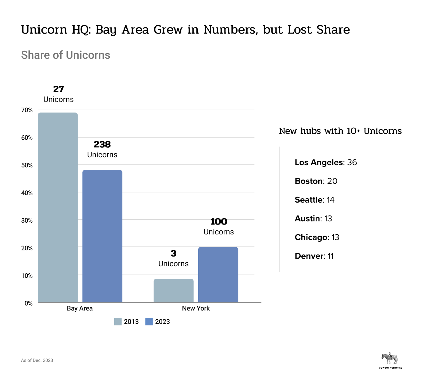 - The Bay Area was home to more unicorns this time around but lost share as other hubs grew.