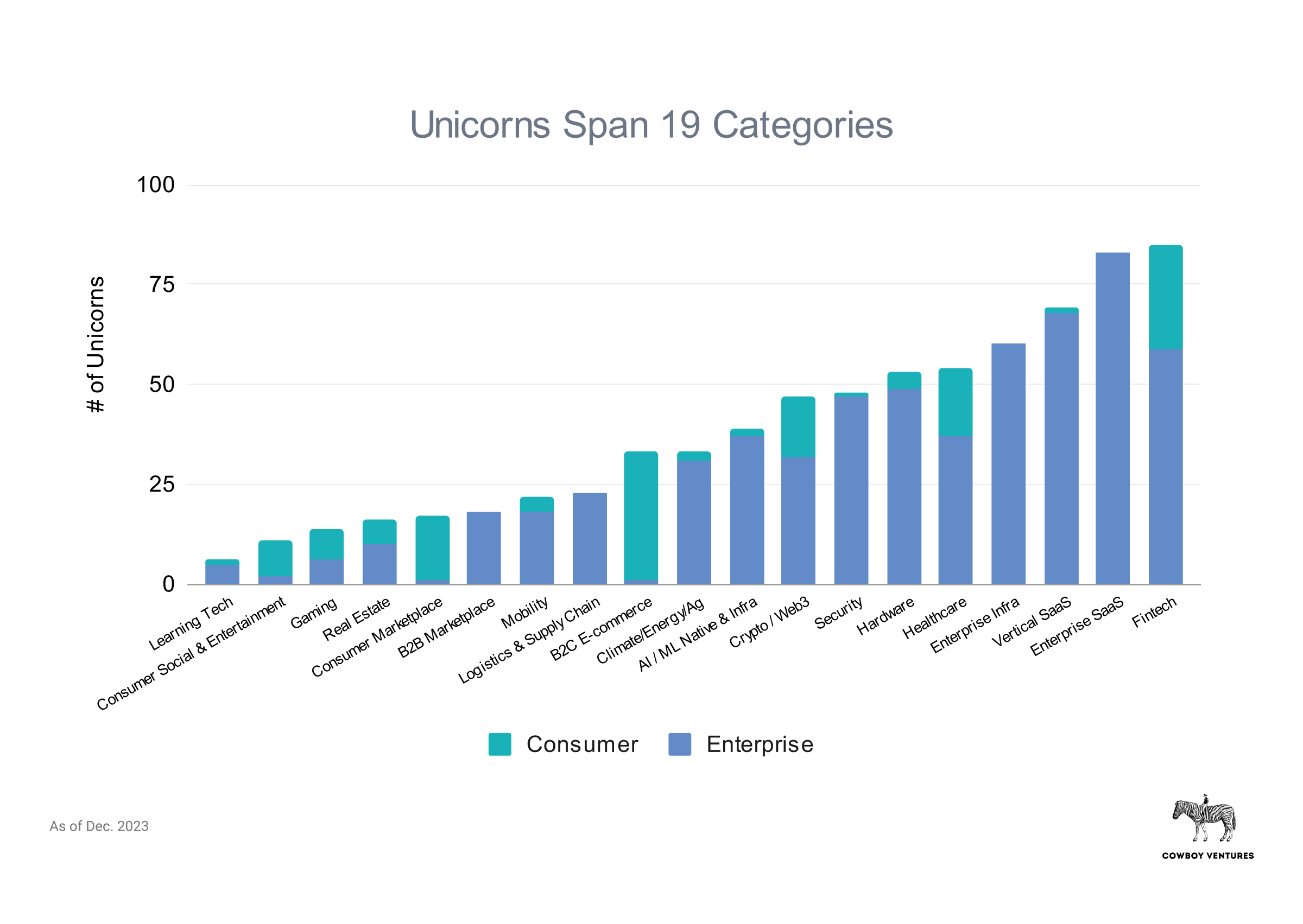 - The pendulum swung hard to enterprise, with 78% of unicorns today focused on B2B, the inverse of 2013.